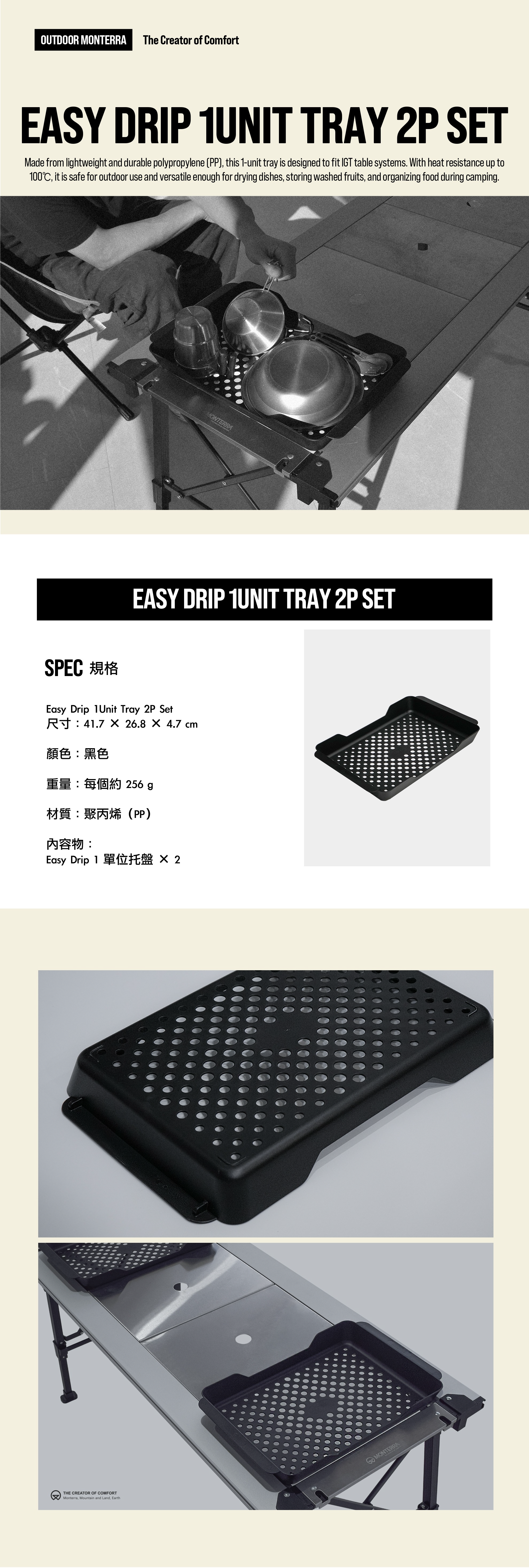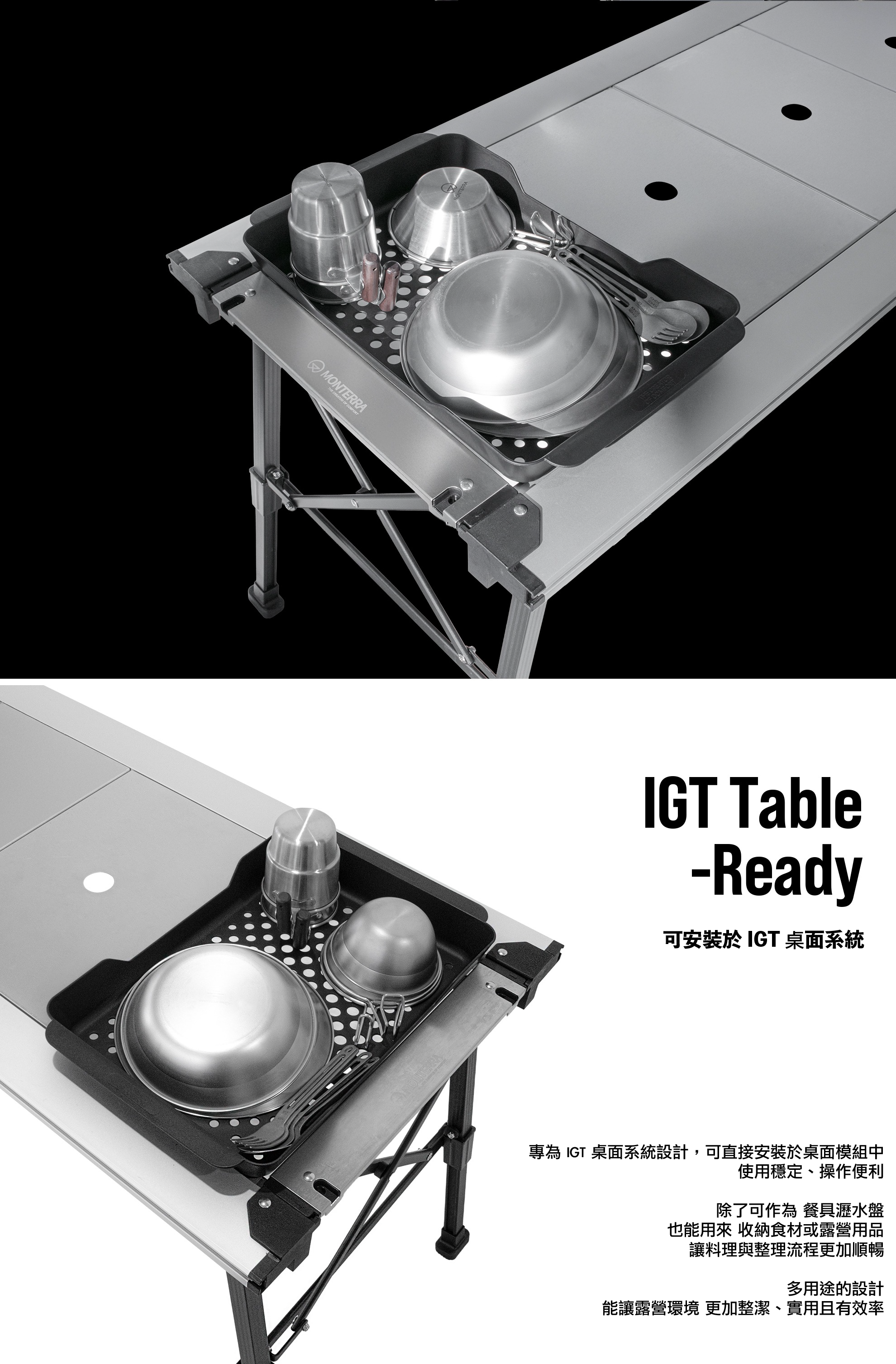 專為 IGT 系統桌設計的多功能托盤,瀝水結構設計,可用於餐具乾燥、食材清洗後暫放或露營料理備料收納,讓桌面更整齊、使用更便利。