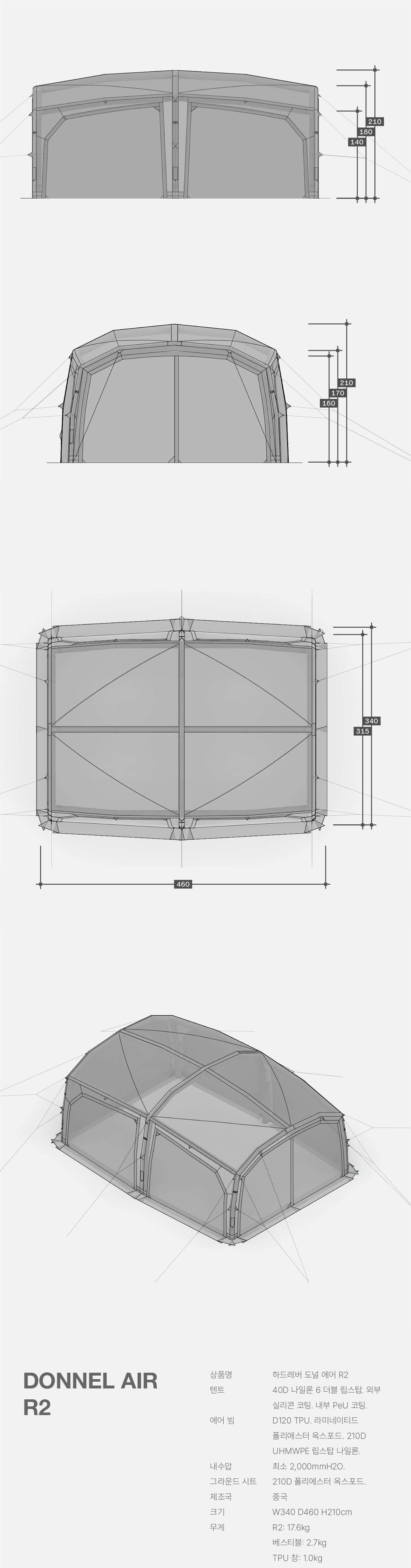 DONNEL AIR R2 是一款為 3–4 人露營需求所設計的中大型充氣式帳篷,結合 Dome 與 Tunnel 的混合結構,在穩定性與空間感之間取得理想平衡。帳體採用高強度 TPU Air Beam 充氣梁,免去傳統營柱,架設快速且安全,即使單人操作也能輕鬆完成。