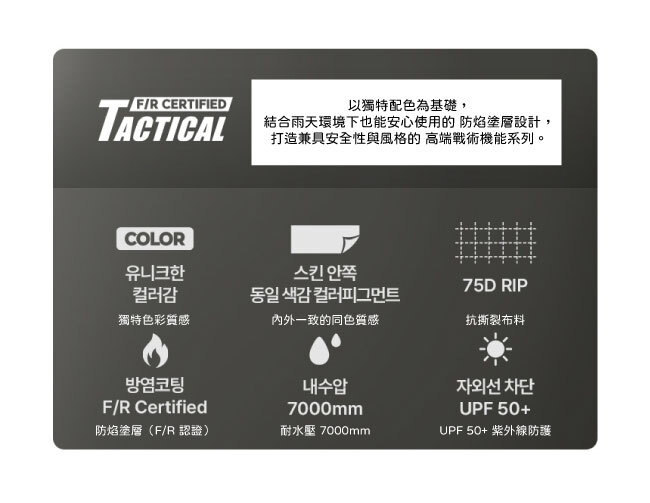 本產品採用 F/R 防焰塗層(Tactical Line),