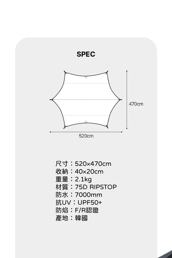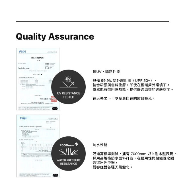 以 75D RIPSTOP 抗撕裂布料 為基礎,搭配 7000mm 高耐水壓與 UPF 50+ 抗UV機能,