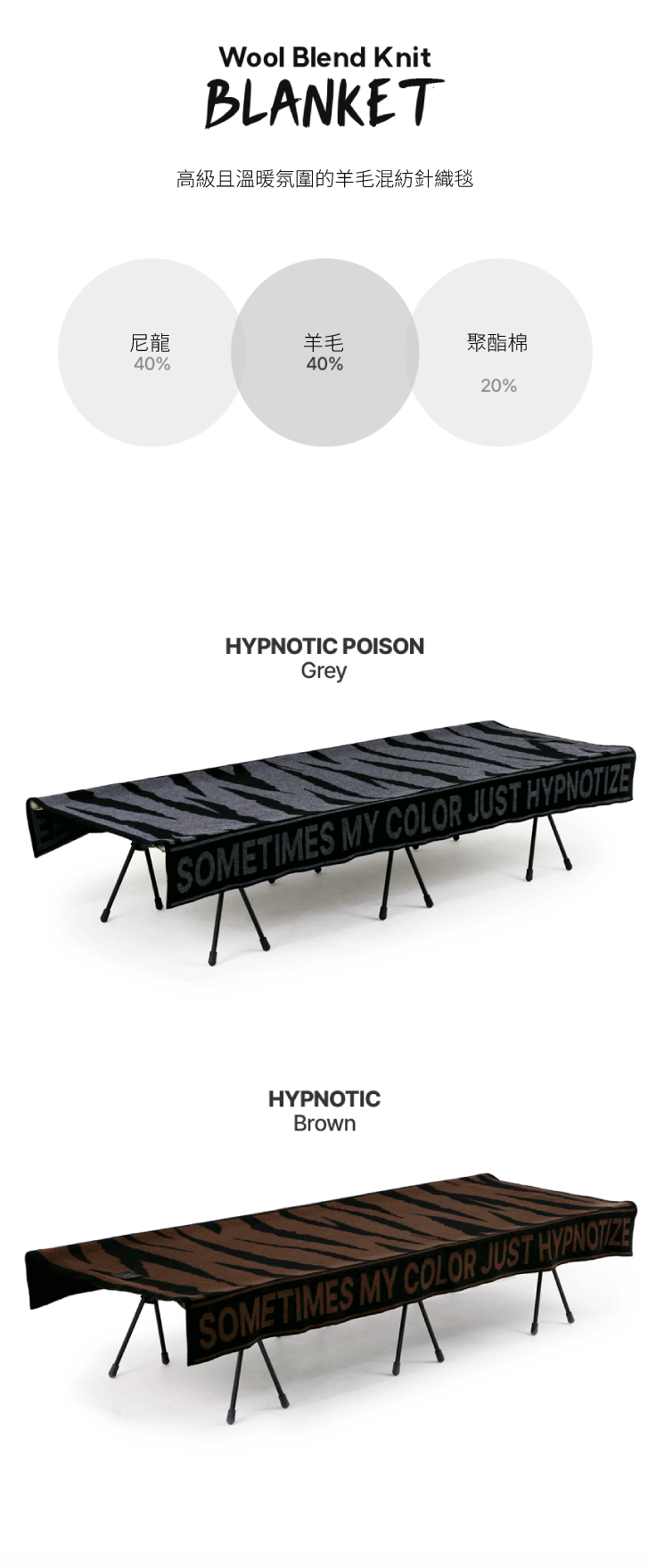 採用羊毛混紡紗線,兼具羊毛的保暖性與尼龍、棉、壓克力的耐用與親膚特性,手感柔軟、溫暖不厚重。